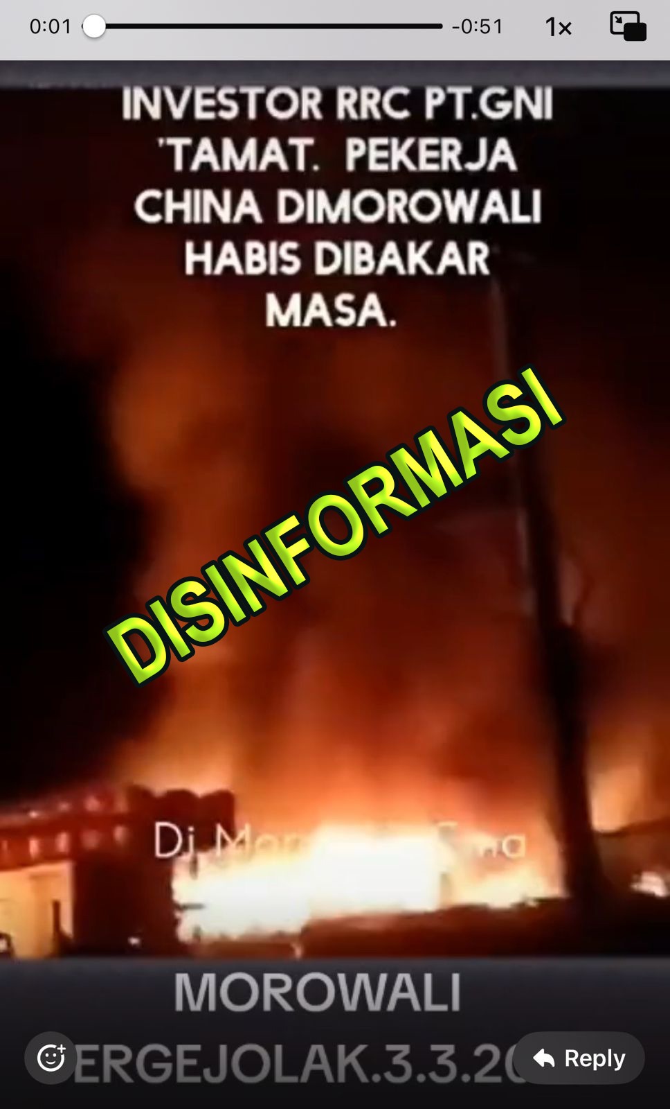 βTidak ada pekerja asing, khususnya pekerja asal China, yang dibakar massa dalam insiden tersebut. Saya berpikir barangkali video tersebut berupaya menggambarkan apa peristiwa kebakaran yang terjadi pada Januari 2023. Namun kejadian tersebut telah ditangani dengan baik. Alhamdulillah hingga saat ini, tidak ada kejadian serupa yang terulang seperti yg tergambarkan dalam video,” jelas Letkol Alzaki.