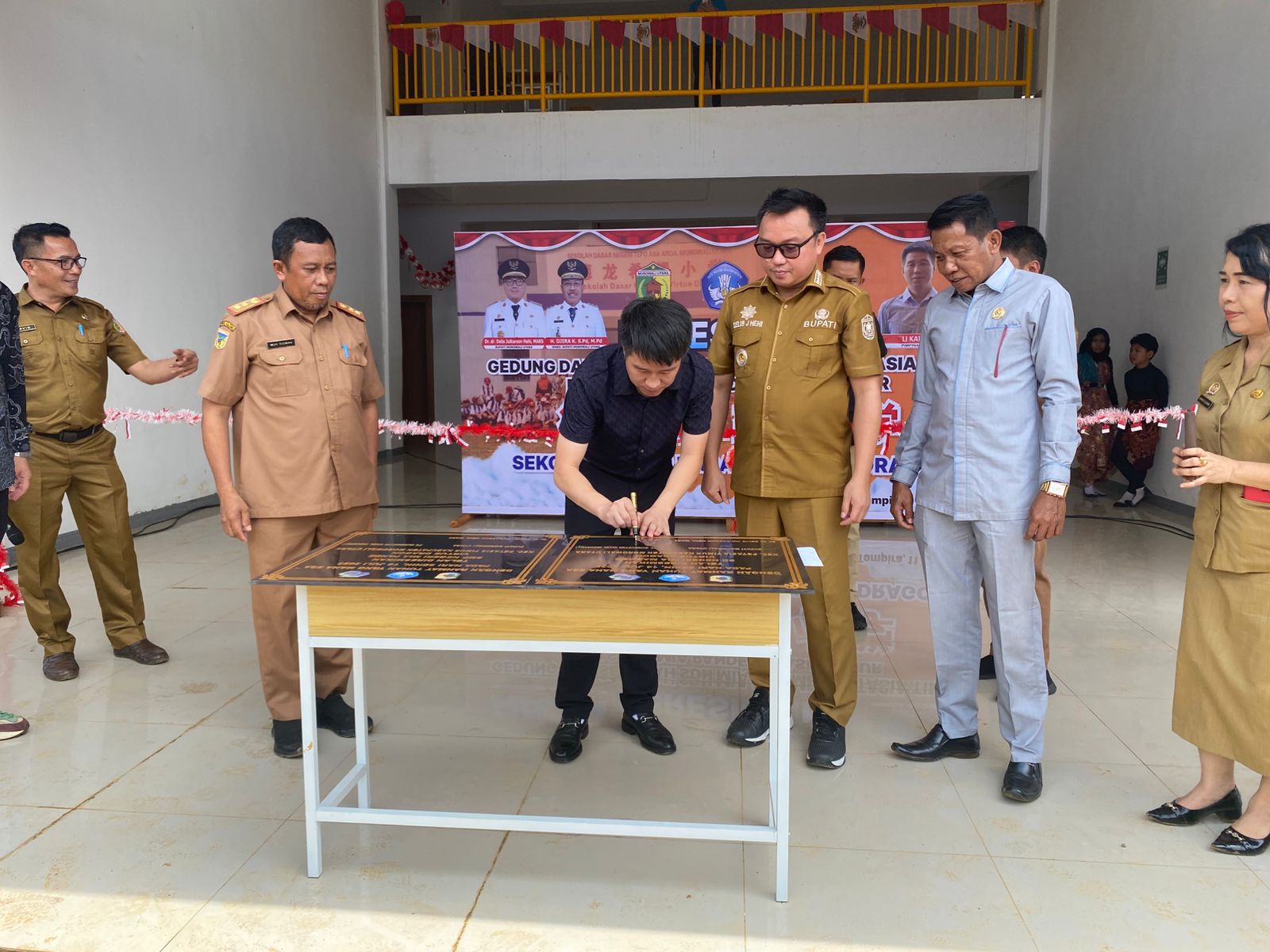 MORUT- Bupati Morowali Utara Delis Julkarson Hehi dan Pimpinan Manajemen Site PT Gunbuster Nikel Industry (GNI) Mister Li Kaiguo meresmikan sekolah harapan PT GNI di Desa Bungintimbe, Kecamatan Petasia Timur Senin (11/8/2025). Gedung sekolah tersebut akan menjadi tempat belajar anak-anak SD Mia Meambo (orang baik) dan SMP Mia Pande (orang pintar).