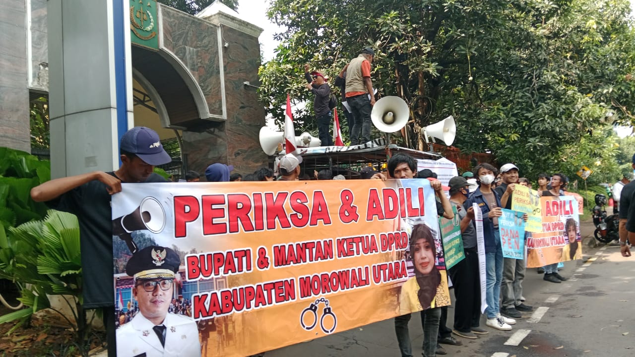 Saat berunjukrasa di depan Mabes Polri dan Kejagung, massa membawa spanduk bertuliskan: Periksa dan Adili Bupati dan Mantan Ketua DPRD Morowali Utara.